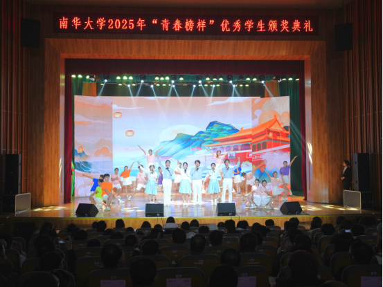 颁奖典礼上,本科生国家奖学金获得者基础医学院2023级学生邓方曦作为获奖代表分享了自己的成长历程,2025级新生代表带来了朗诵表演《我的青春》,南华大学大艺团合唱团、土木工程学院、资源环境与安全工程学院舞蹈队带来了歌舞表演《我们都是追梦人》,2025年最美大学生获得者带来了舞台剧《榜样之声》,现场师生共同观看了南华大学原创情景剧《青山》。
