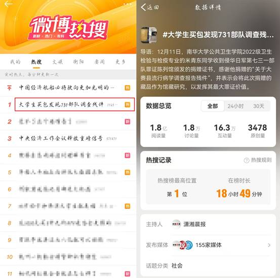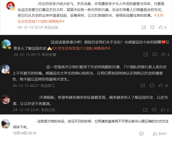 米青东捐赠史料的事迹经媒体报道后,迅速引发全社会强烈反响。新华社、人民日报、光明日报、央视新闻等30 余家权威媒体聚焦报道,微博话题“大学生买包发现731 部队调查残件”冲上热搜榜第一,短时间内阅读量达1.8 亿,讨论量超过 1.8 万。相关话题在百度、B 站等平台同步登顶热搜,全网综合传播量突破 2 亿次。