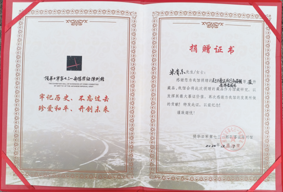 12 月 11 日,米青东收到了侵华日军第七三一部队罪证陈列馆颁发的捐赠证书,证书上写道:“感谢您捐赠的‘关于大赉县流行病学调查报告残件’,我馆将作为馆藏研究,以发挥其最大罪证价值”。从偶然发现到专业鉴定,从无偿捐赠到正式入藏,这位“00 后”大学生用果断行动完成了一次跨越千里的历史对话。