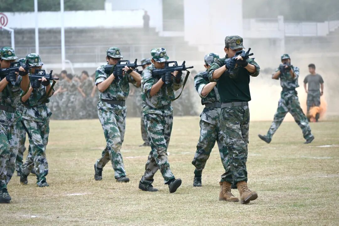 随后,军训成果汇报表演开始。分列式汇演率先登场,操场上各方阵队列严整、挺拔如松、步履铿锵、气势如虹。新生们以满腔的热情和昂扬的斗志,依次通过主席台接受检阅。擒敌拳气贯山河、虎虎生威,匕首操精准凌厉、锐不可当,棍棒术英姿矫健、气势恢宏,团体操活力四射、整齐划一,彩烟中战术表演逼真紧张,战术行进沉着迅捷,军训科目演练充分展现了南华学子“勤勉务实、甘于奉献、刚健自强、敢为人先”的精神面貌,赢得了现场师生的阵阵掌声和欢呼声。