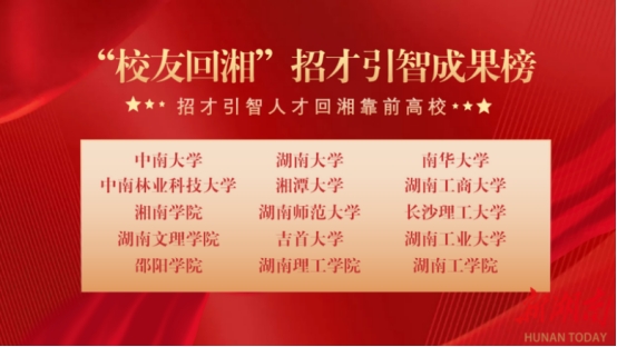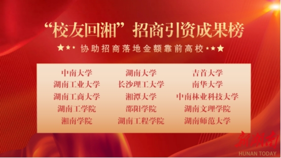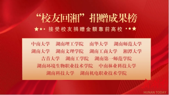 会上发布的“校友回湘”工作成果榜单,南华大学四项数据指标均名列前茅:招才引智人才回湘数位列全省第3位,与校友企业开展科研转化成果位列全省第5位,协助招商落地金额位列全省第6位,接受校友捐赠金额位列全省第3位。