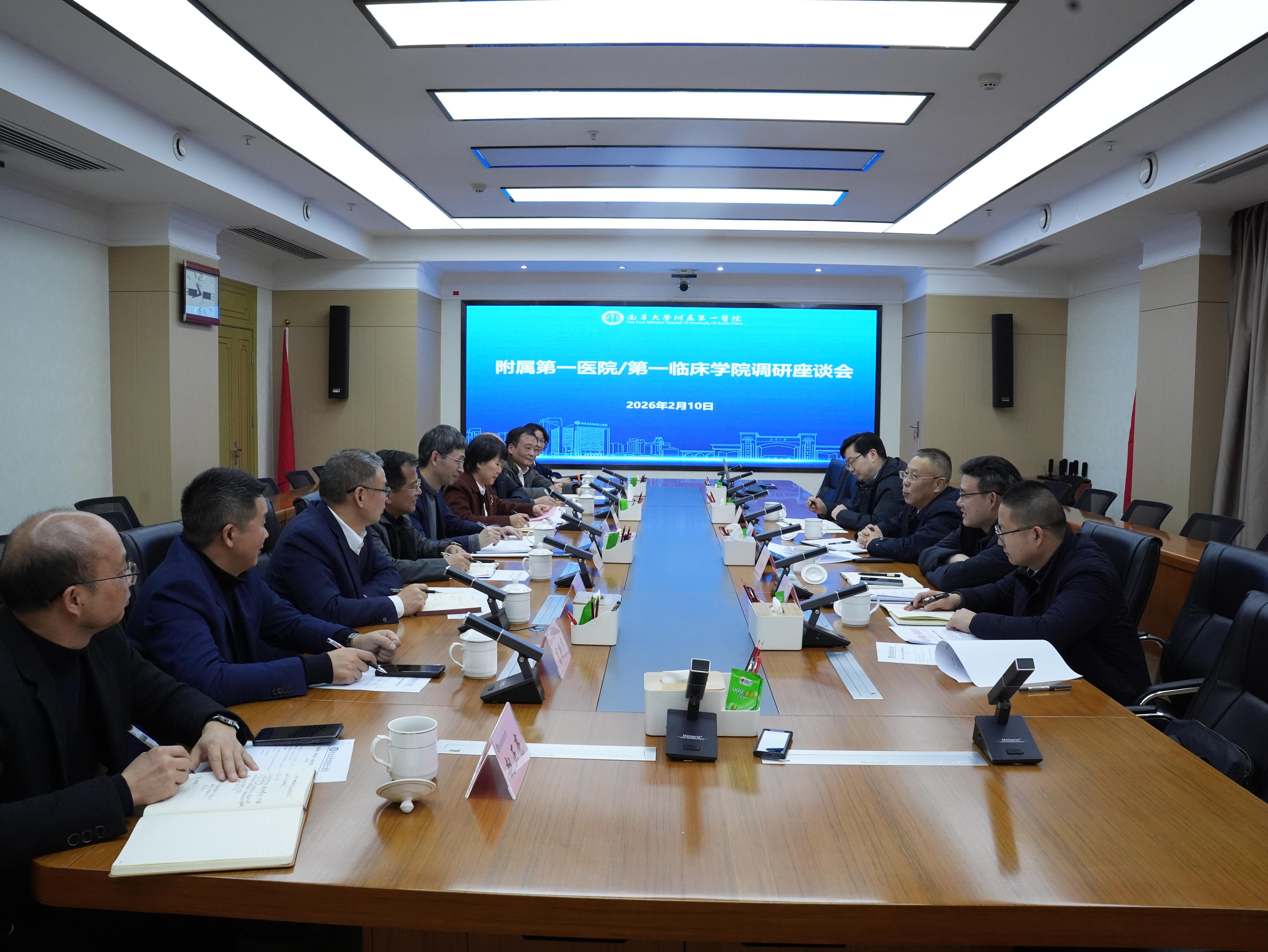 2月10日上午,南华大学党委书记唐忠阳赴附属第一医院调研并召开座谈会。他强调,要深入学习贯彻党的二十届四中全会精神,坚持党建引领,科学制定“十五五”发展规划,进一步明确目标,厘清发展思路,推动医院高质量发展再上新台阶,为学校“双一流”建设贡献力量。