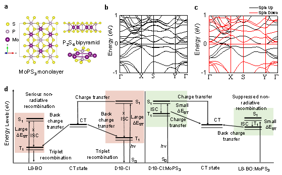 (a)单层MoPS3的结构;(b)含有自旋-轨道耦合与(c)不含自旋-轨道耦合的MoPS3的能带结构图;(d)D18-Cl与L8-BO之间相应的S1、T1、CT以及在有/无MoPS3纳米晶体的情况下的电荷转移