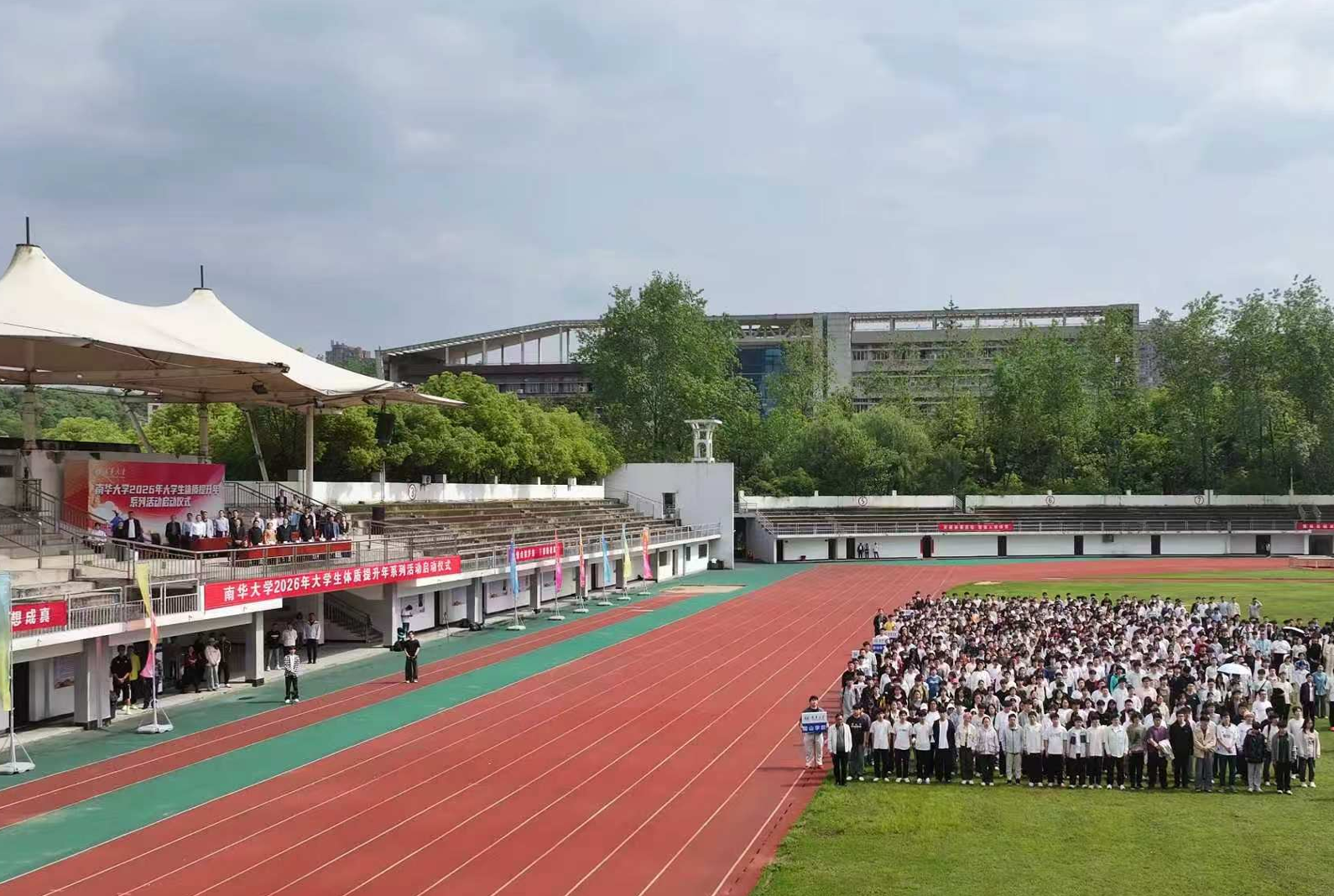 4月24日,南华大学2026年大学生体质提升年系列活动启动仪式在红湘校区北运动场举行。校党委书记唐忠阳出席启动仪式并宣布大学生体质提升年系列活动启动。校党委委员、副校长胡崇宇主持。