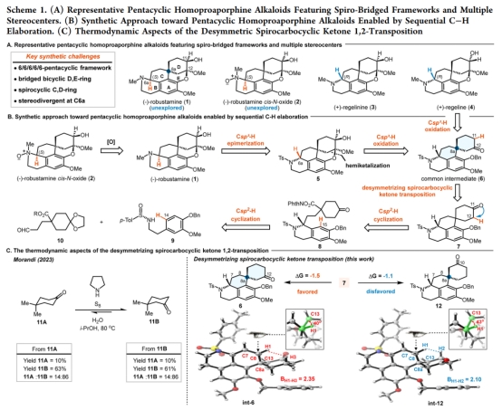 具有螺环-桥环骨架和多个立体中心的四氢异喹啉生物碱(如吗啡和曲贝替定743)展现出显著的结构多样性与广泛生物活性,一直是天然产物合成化热点和前沿领域之一。在生物活性方面,含有螺环-桥环的多环活性天然产物以独特三维空间结构,通过增强分子构象刚性和结合特异性,显著影响其生物活性。其中,五环高原阿朴啡碱是一类主要从秋水仙科植物中分离的四氢异喹啉类天然产物。结构上,该类分子具有独特的6/6/6/6/6五元并环体系,包括螺环-桥环骨架及多位点立体化学差异,使得其立体多样性合成极具挑战。团队通过逐步C-H键精准调控策略,设计两阶段C-H键环化和官能团途径,实现含螺环-桥环4种五环高原阿朴啡碱的立体多样性合成。