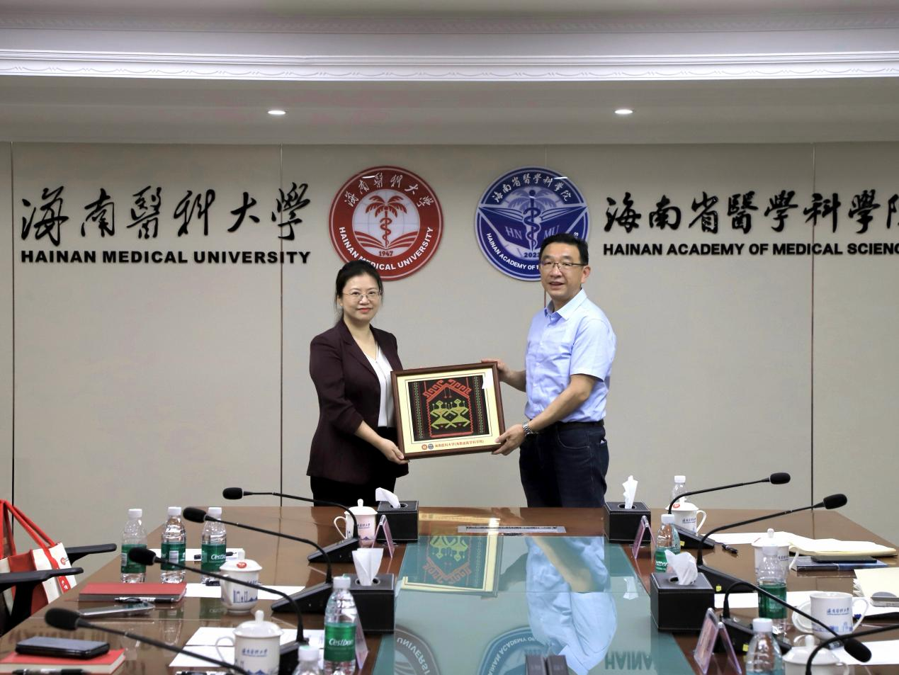 在海南医科大学,于涛一行参观了校史馆,了解学校发展历程及医学教育特色。座谈会上,海南医科大学副校长曾敏以“有发生,必有发展”为题,介绍了学校在管理体制、教育教学、科技体制、人才体制等方面的改革举措与成效。于涛说明了此次调研背景及南华大学基本情况,教务部部长彭国文重点介绍了学校本科教育教学现状与改革方向。双方围绕专业动态调整机制、课程改革、以学生为中心的课堂教学改革等议题展开热烈讨论。海南医科大学教务处处长李其富等就相关问题予以回应,分享了该校在教学改革、专业调整、课程建设等方面的实践经验。会后,曾敏代表海南医科大学向南华大学赠送黎锦文创纪念品,双方表示将在医学教育资源共享、师资培养等方面加强合作。