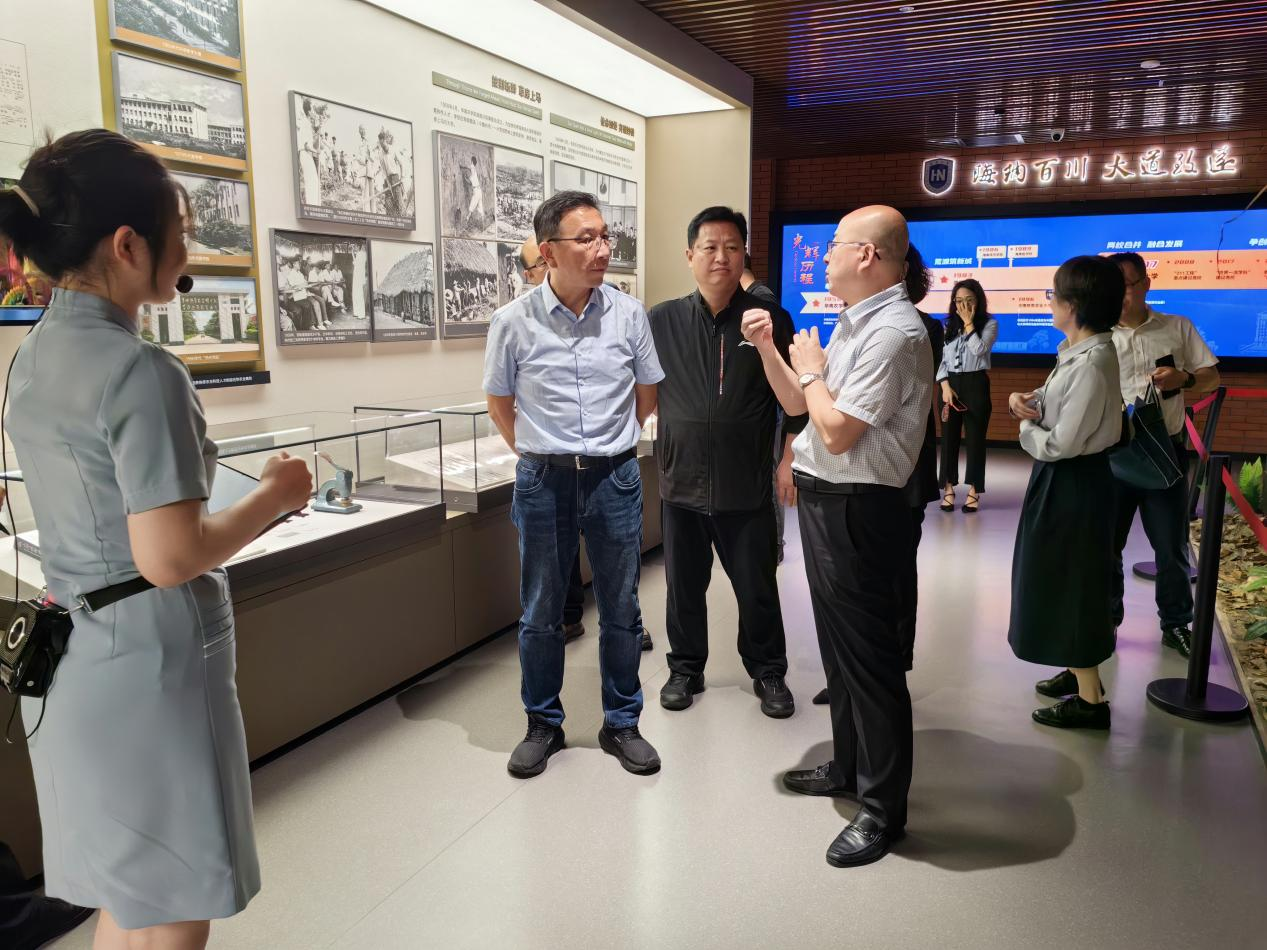 当日下午,调研组赴海南大学开展交流。海南大学副校长兼本科生院院长岳文及相关部门负责人参加座谈。岳文系统介绍了海南大学近年来在“双一流”建设背景下的教育改革实践,重点分享了本科生院运行机制、完全学分制改革、协同创新中心建设及本硕博贯通培养等创新举措。于涛进一步说明了调研目的,表达了学习借鉴海南大学综合改革经验的期望。双方围绕教师教学发展、教育信息化、创新创业教育等具体问题展开交流。会后,调研组参观了海南大学校史馆,深入了解该校历史积淀与创新发展成果。