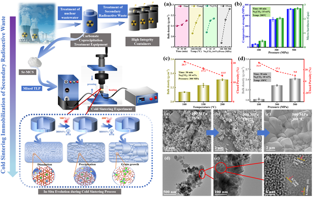 福岛核事故后,ALPS系统处理废水时产生的含锶镁钙混合碳酸盐污泥(Sr-MCS)是困扰全球核安全领域的典型二次放射性废物,不仅放射性核素含量高、化学组成复杂,更为关键的是,传统处理方法难以兼顾安全性与经济性,成为行业内难以突破的技术瓶颈。此前,传统高温固化技术(如玻璃固化)需1000℃以上高温,极易导致碳酸盐分解挥发,进而降低固化体致密性和结构稳定性,难以满足实际工程应用的严苛需求。为破解这一行业痛点,团队秉持“创新破局”的思路,创新性地将冷烧结技术(Cold SinteringProcess)应用于放射性污泥固化处理,自主开发了基于低温高压条件的锶固化新工艺。该技术以15 wt% 1M Na₂CO₃为瞬态液相,在200℃低温、500 MPa高压条件下烧结1小时,成功将含锶碳酸盐污泥转化为高密度、高稳定性的陶瓷固化体。材料表征结果表明,固化体相对密度达96%,抗压强度高达719 MPa(约为普通混凝土的10倍),显微硬度达2.69 GPa,展现出优异的机械性能。