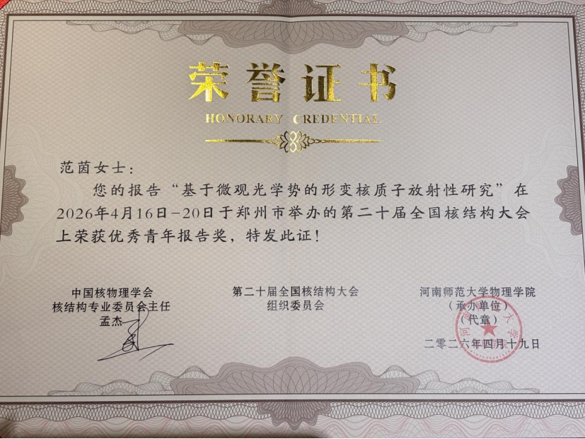 这次获奖是李小华教授团队继2018年16级硕士生邓军刚于全国核结构会议、2023年21级硕士生亓林静于全国核反应会议获优秀青年报告奖之后,于核物理领域全国高水平会议获得的又一优秀青年报告奖。
