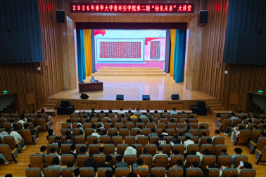 4月13日,资源环境与安全工程学院2026年第二期“铀见未来”大讲堂在南华礼堂举行。本期大讲堂邀请湖南省政协委员、校工会常务副主席陈柒叁研究员作《从毛泽东诗词中汲取干事创业的力量》报告,带领全院师生在诗意与哲理中回望峥嵘岁月、叩问初心使命。院党委书记张志军主持报告会。院党委副书记谭杰及相关系室教师、学生代表700余人参加。