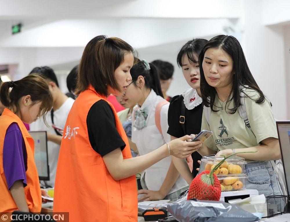 ↑2021年6月8日,在湖南省衡阳市南华大学快递综合服务中心,工作人员通过手机为学生办理业务。CICPHOTO/汪普林 摄
