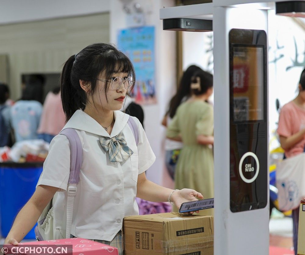↑2021年6月8日,在湖南省衡阳市南华大学快递综合服务中心,学生通过自助取件设备验证身份信息。CICPHOTO/汪普林 摄