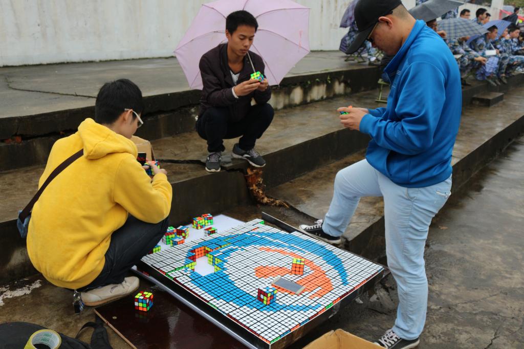 魔方协会的负责人谷海权一大早就召集魔方协会会员,抬来魔方,用一个半小时左右拼出计算机科学与技术学院的院徽,摆放在观众台旁边,为学院运动员加油助威。