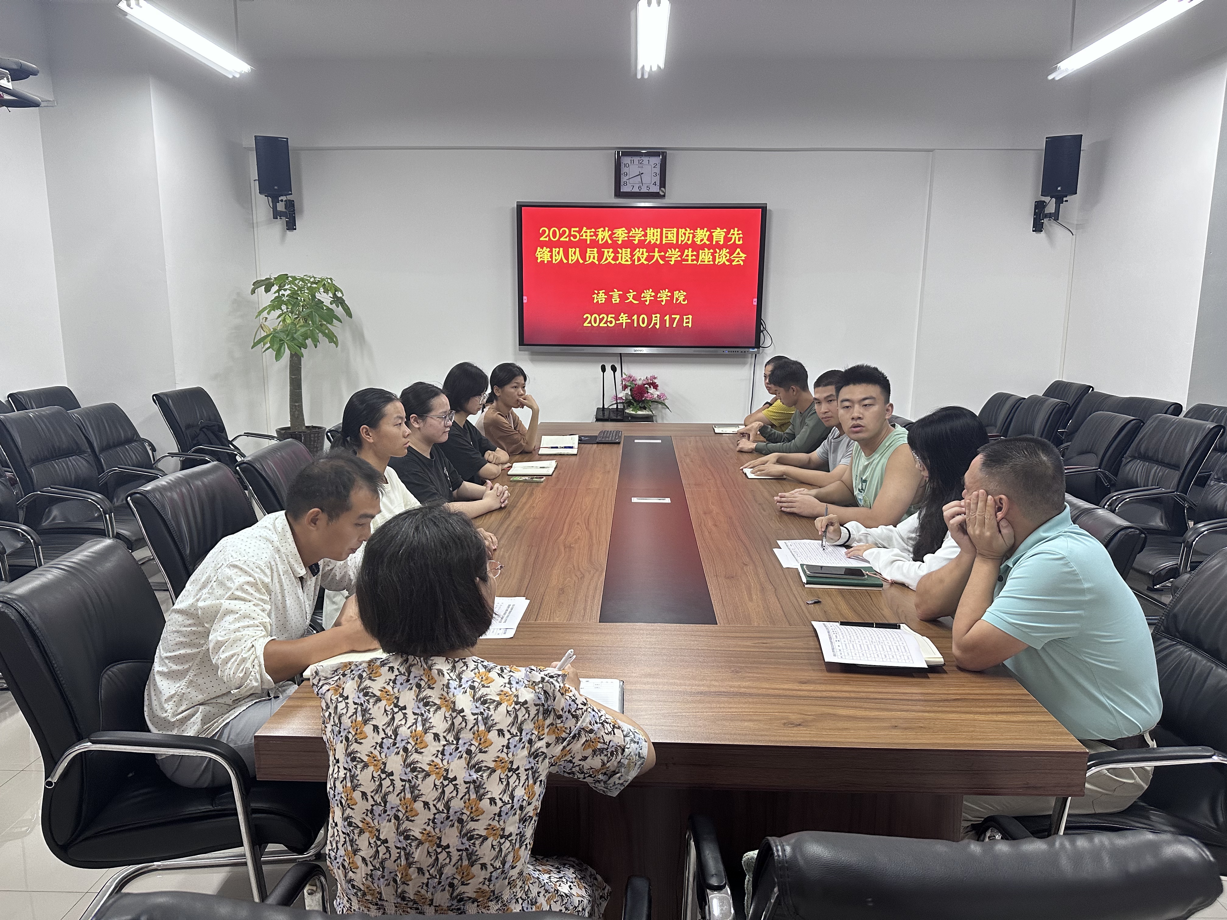 10月17日下午,语言文学学院于崇礼楼北410会议室召开2025年秋季学期国防教育先锋队队员及退役大学生座谈会。学院党委副书记周艳玲,相关辅导员及先锋队全体队员参会。