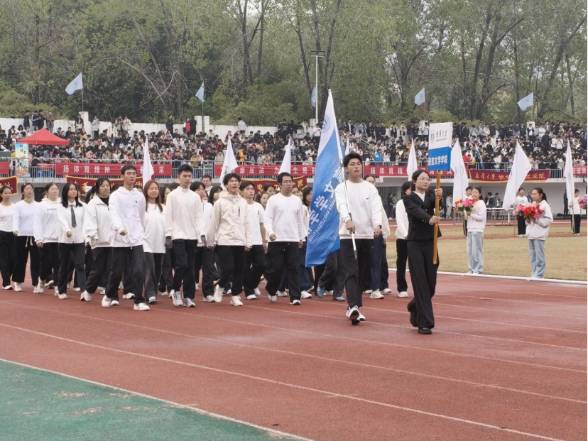 语言文学学院学子身着白衣黑裤的整齐服装,以饱满热情与昂扬姿态组成方阵亮相。伴随着音乐,他们迈着铿锵的步伐入场,精神抖擞、意气风发,嘹亮的“字里行间藏锐气,赛场内外展风华”口号回荡全场,彰显出文院学子文武兼修的精神风貌。方阵前方,蓝色院旗迎风飘扬,其上大字熠熠生辉,凝聚着全院师生的向心力,赢得现场观众阵阵喝彩。