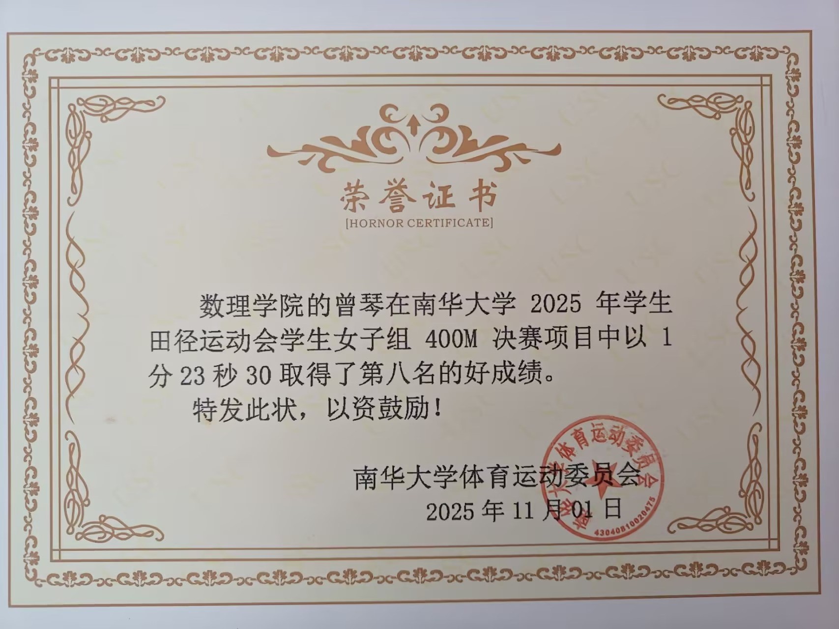 在南华大学2025年学生田径运动会女子组400米决赛赛场上,我院学子曾琴以饱满的精神状态踏上赛道。发令枪响后,她凭借扎实的训练功底与稳定的节奏把控,在弯道加速、直道冲刺的较量中一路奋进,最终以1分23秒30的成绩,成功斩获该项目第八名!