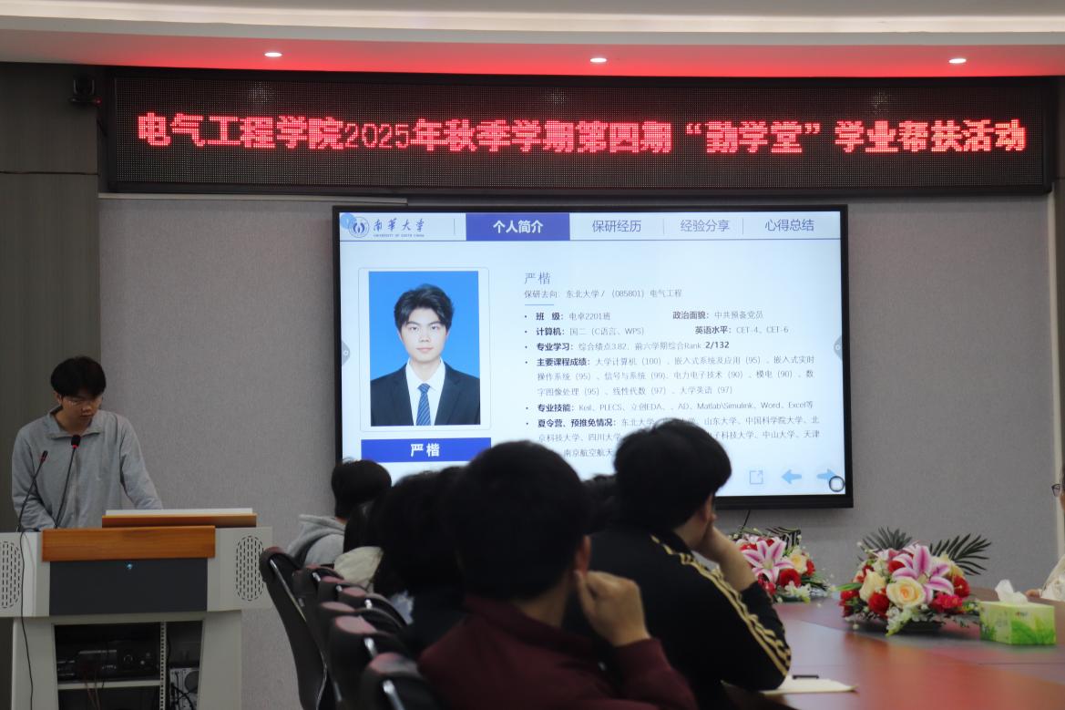11月6日,电气工程学院在崇业楼会议室举办了2025年秋季学期第四期“勤学堂”学业帮扶活动。本次活动邀请国家奖学金获得者严楷担任主讲,围绕“保研与竞赛”主题进行分享,吸引了百余名同学踊跃参与。现场反响热烈,学习氛围浓厚。