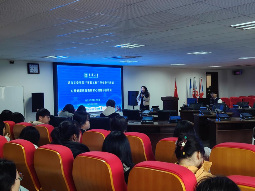 为切实发挥心理委员在心理健康教育中的“桥梁纽带”作用,11月10日中午,语言文学学院在崇礼楼北406开展“菁蓝工程”第三期学生骨干培训——心理健康教育暨朋辈心理辅导员培训。学院团委书记肖玲慧主讲,全体心理委员和25级班助与会。