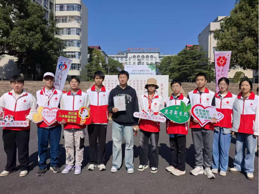 为提升医学生素养,践行健康中国战略,11月16日上午,衡阳市红十字志愿服务中心同南华大学衡阳医学院红十字志愿者服务队,在放飞广场举办“热血南华,‘髓’力同行”红十字公益活动,宣传红十字基本精神、科普“三献”知识和号召献血入库。