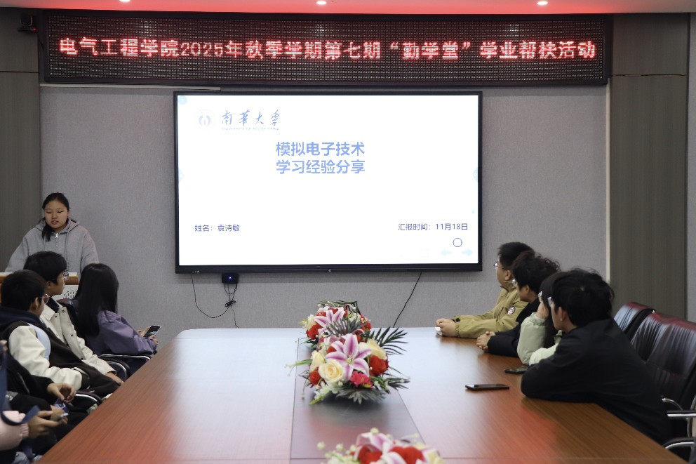 11月18日,电气工程学院在崇业楼举办2025年秋季学期第七期“勤学堂”学业帮扶活动。本期活动聚焦“模拟电子技术”课程,特邀国家奖学金获得者袁诗敏担任主讲人,为同学们带来一场内容充实的专题分享。