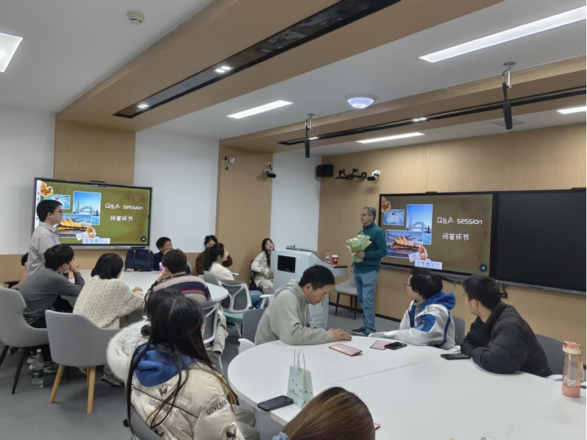 互动环节中,“Q&A Session”点燃全场热情。同学们踊跃用英语提问,从留学生与澳洲特有动物的相处日常,到中澳课堂文化的细微差异,言语间满是好奇与向往。师生围坐交谈,英语不再是刻板的语法符号,而是传递思绪、联结心灵的桥梁,陌生的身影在坦诚对话中,成为共赴文化之约的同路人。