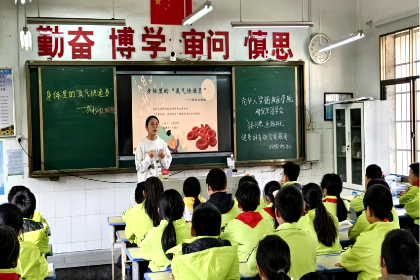 为服务健康中国战略,为儿童普及健康科学知识,促进研究生综合素质能力提升,11月28日,衡阳医学院研究生“青春向党医路阳光”健康科普社会实践团走进蒸湘区实验小学六年级1班,开展了一场生动有趣的红细胞科普讲座。主讲人小曾老师以“身体里的‘氧气快递员’”为主题,带领同学们探索红细胞的奥秘。