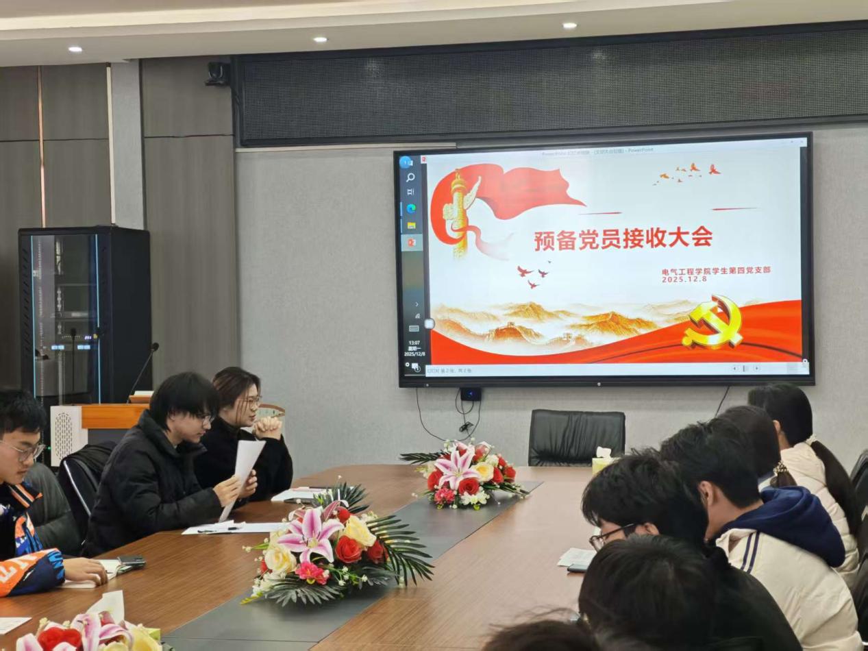12月8日,电气工程学院学生第四党支部在崇业楼会议室召开预备党员接收大会。党支部书记邱粤湘、全体学生党员及预备党员参加会议。会议由党支部副书记简文洋主持。