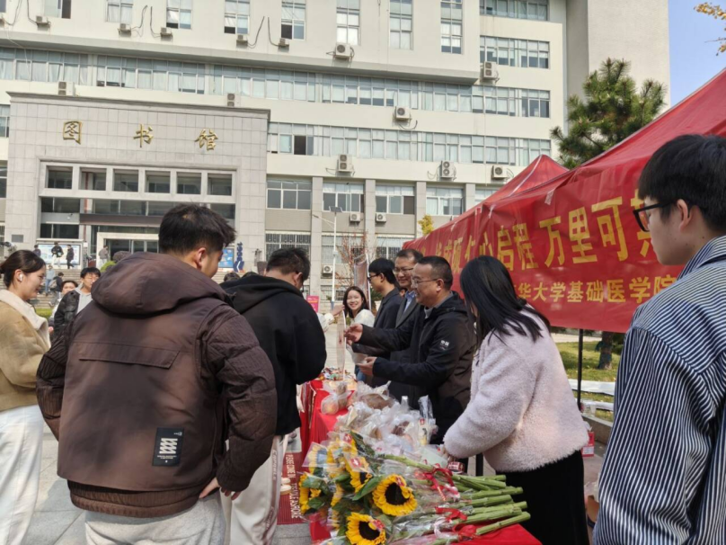 为缓解正处于考研冲刺关键阶段的医学生备考压力,12月10日上午,基础医学院在红湘校区图书馆前坪举办“冲出好运,一研为定”考研冲刺助力活动,学院为考研学子们贴心准备了400余份考研助力包,内含心想事“橙”、上岸锦鲤钥匙扣、棒棒糖、信封等诸多礼品,在给同学们带来轻松欢愉的同时,帮助考生卸下心理包袱,轻装上阵,走好“研”途最后一公里。