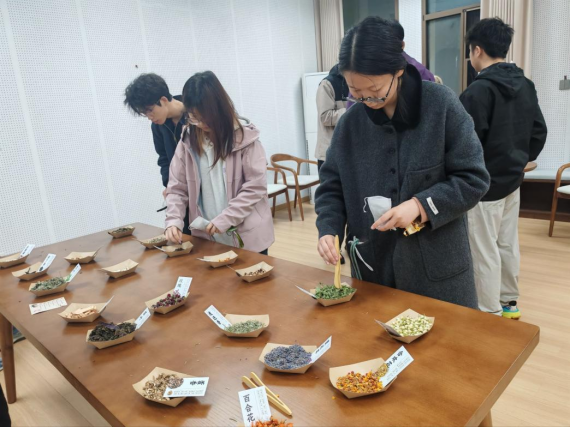 活动以清明文化小科普温情启幕,工作人员细致讲解了清明节佩戴香囊驱邪避灾、祈福安康的传统民俗内涵,同时详细介绍了艾草、薰衣草等安神舒缓类中药材的养生功效,让同学们在动手制作前,充分体会到传统民俗与心理健康关怀的深度融合。
