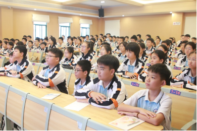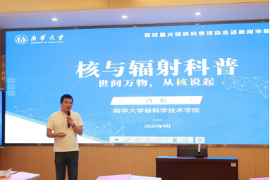 签约仪式结束后,核科学技术学院核工程与核技术系主任冯松为船山实验中学100余名师生带来了一场以“核与辐射科普-世间万物,从核说起”为题的科普讲座。报告从“纸不能无限折叠,尺不能无限对切”这一常识开始,引发同学们思考如何“看见”微观世界、原子核尺度的世界长什么样、物质世界又是由什么最基本的单元组成等问题。进而通过三步走的方式,介绍了我国核工业的发展历史、现状、未来,鼓励同学们在复杂的国际形势下要坚定不移地走高质量自主发展道路,要敢为人先。报告的最后,冯松博士还向同学们科普了无处不在的核辐射,引导学生正确看待电离辐射。同学们学习热情高涨,报告现场气氛热烈。