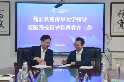 9月26日上午,南华大学“星火馆”负责人、核科学技术学院院长罗文一行来到衡阳市船山实验中学(以下简称船山实验中学),参加南华大学科学技术协会与船山实验中学关于湖南省“高校星火馆”科普教育资源下沉服务合作协议的签署仪式。签约仪式由船山实验中学校长周广柱主持。