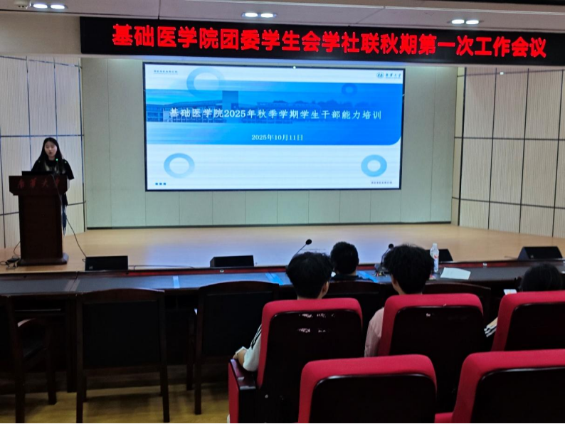 为总结上学期工作经验,明确团学工作发展方向,10月11日下午,基础医学院团委学生会学社联秋季第一场工作会议于医研楼报告厅举行。院党委副书记卢清华、团委书记金锦涛及团委学生会学社联全体学生干部参会。