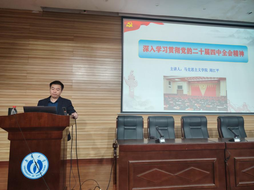 11月9日,马克思主义学院副院长周江平教授应邀在雨母校区崇业楼学术报告厅,以“深入学习贯彻党的二十届四中全会精神”为主题,为计算机学院入党积极分子培训班学员们解读党的二十届四中全会精神,并深入阐释了“十五五”规划的战略部署与时代价值。