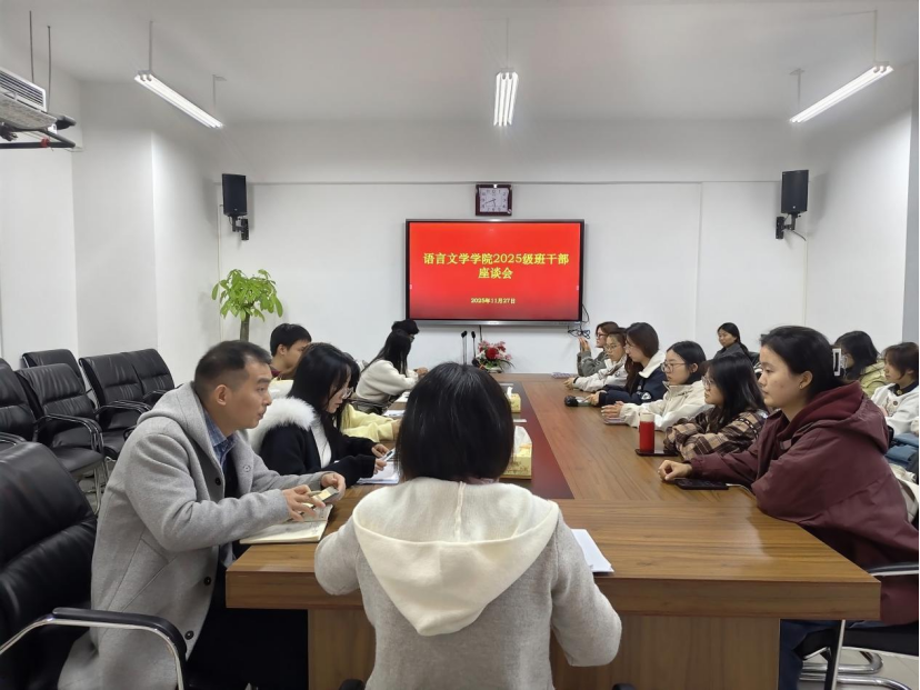 11月27日中午,语言文学学院2025级班干部座谈会在崇礼楼北410会议室召开。学院党委副书记周艳玲、学工室主任肖勇以及25级班长、团支书参会。