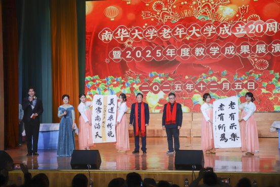 12月5日下午,南华大学老年大学成立20周年暨2025年度教学成果展演举办。离退休服务中心职工、老同志代表、老年学员以及青年学生代表共300余人参加。