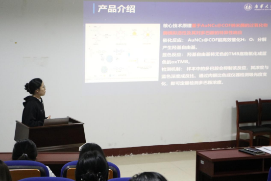 答辩环节中,多支团队次第亮相,带来兼具创新性与实用性的项目:有的聚焦乡村医疗痛点,研发便携检测设备,让基层群众在家门口即可享受便捷检测服务;有的关注食品安全,设计可降解智能包装,实现食品新鲜度可视化监测;另有团队瞄准粮食安全与农业健康,推出快速检测技术与精准防控方案,覆盖食品毒素检测、大棚作物病害防治等多个应用领域。各团队通过清晰的PPT演示,从项目背景、核心功能到应用前景展开详细阐述,充分展现了扎实的专业基础与创新思维。