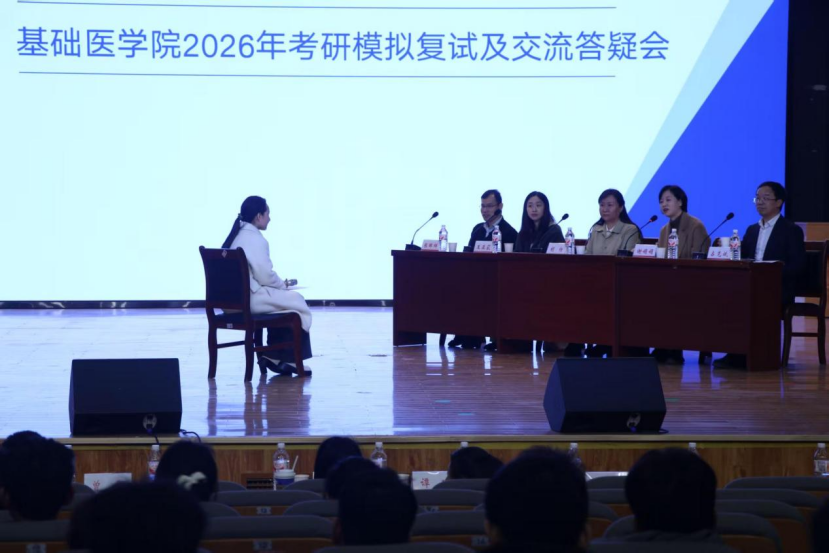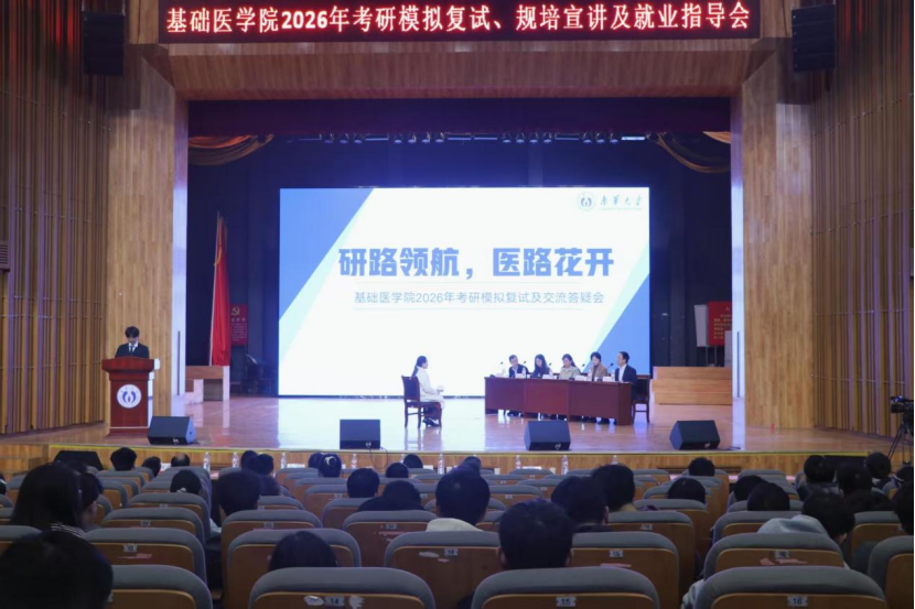 为帮助2026届毕业生深入了解考研、规培与就业相关情况,提升就业质量,3月12日下午,基础医学院在南校大礼堂举办2026年考研模拟复试、规培宣讲及就业指导会。衡阳医学院党委副书记卢清华、副院长曾希、附属妇幼保健院副院长肖帅等参加活动,来自附属第一医院、附属第二医院、附属南华医院的专家教师受邀担任模拟考官。学院及各附属医院研究生招生办公室负责老师参加活动。近300名学生到场参与,线上同步吸引3000余名校外毕业生及低年级同学观看。
