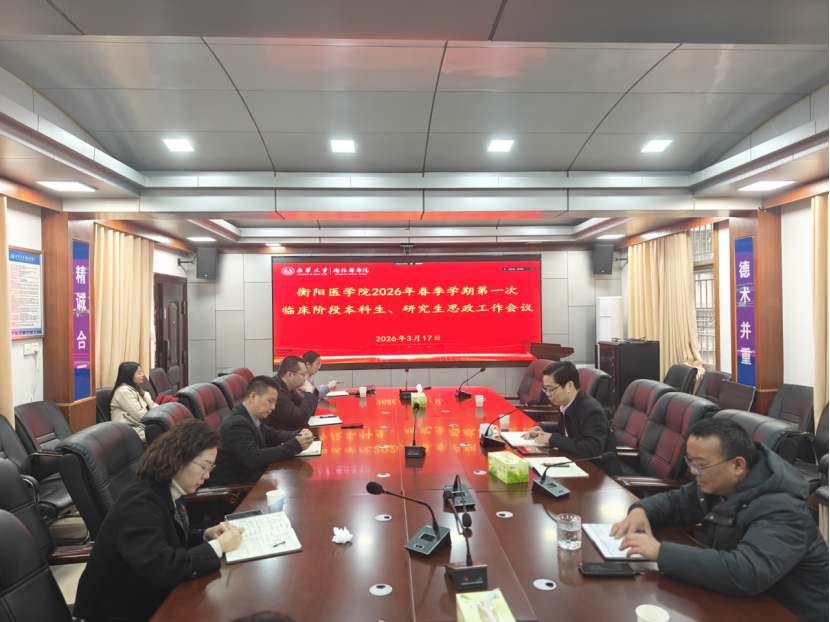 3月17日下午,衡阳医学院党委召开了2026年春季学期第一次临床阶段本科生、研究生思政工作会议。会议由院党委书记曾国主持,院党委副书记卢清华,副院长周洲、曾希、刘翔,各临床学院分管学生工作副院长,以及学院相关辅导员、各临床学院分管学生工作教师参加会议。