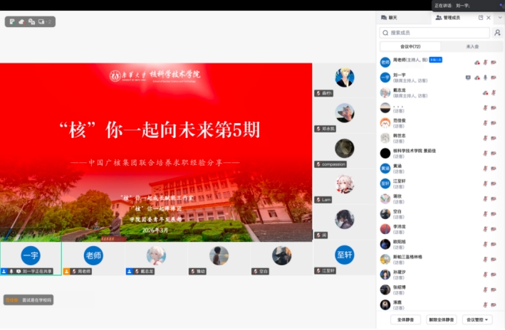 为帮助核院学子了解就业形势,深入了解校企联合培养项目,科学规划个人职业发展路径,3月21日,核科学技术学院举办“‘核’你一起向未来”第5期活动。本期活动聚焦中国广核集团联合培养项目解读与求职经验分享,特邀2025届核工程与核技术专业校友、中广核工程有限公司员工刘一宇主讲。活动采用线上方式开展,学院2023级本科生等近100名学生参加。活动由辅导员周华国主持。