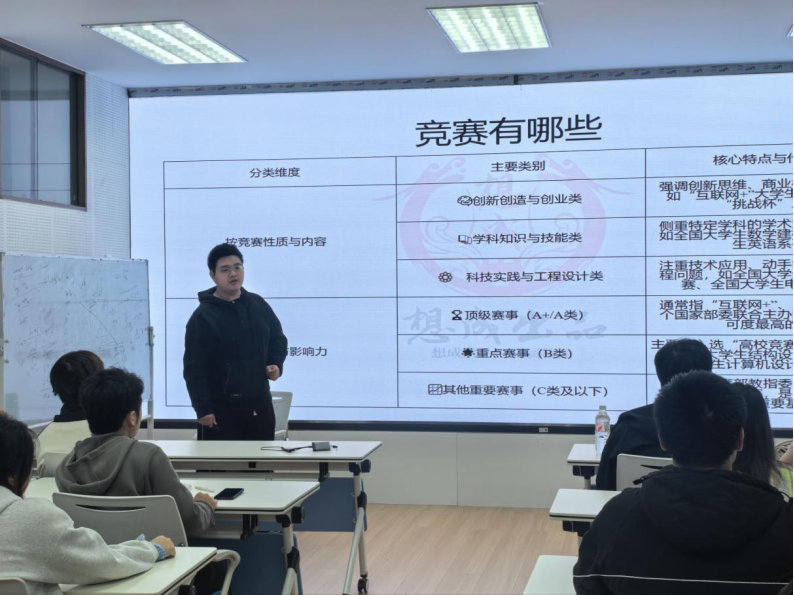 活动中,李想成围绕竞赛全流程、核心要点进行系统讲解。他阐释了参与学科竞赛的重要价值,指出竞赛不仅带来保研加分、赛事奖励等实际收益,更能重塑思维模式,全面提升信息收集、调研实践、沟通表达与知识应用等综合能力,助力学生突破课堂局限、实现全面发展。
