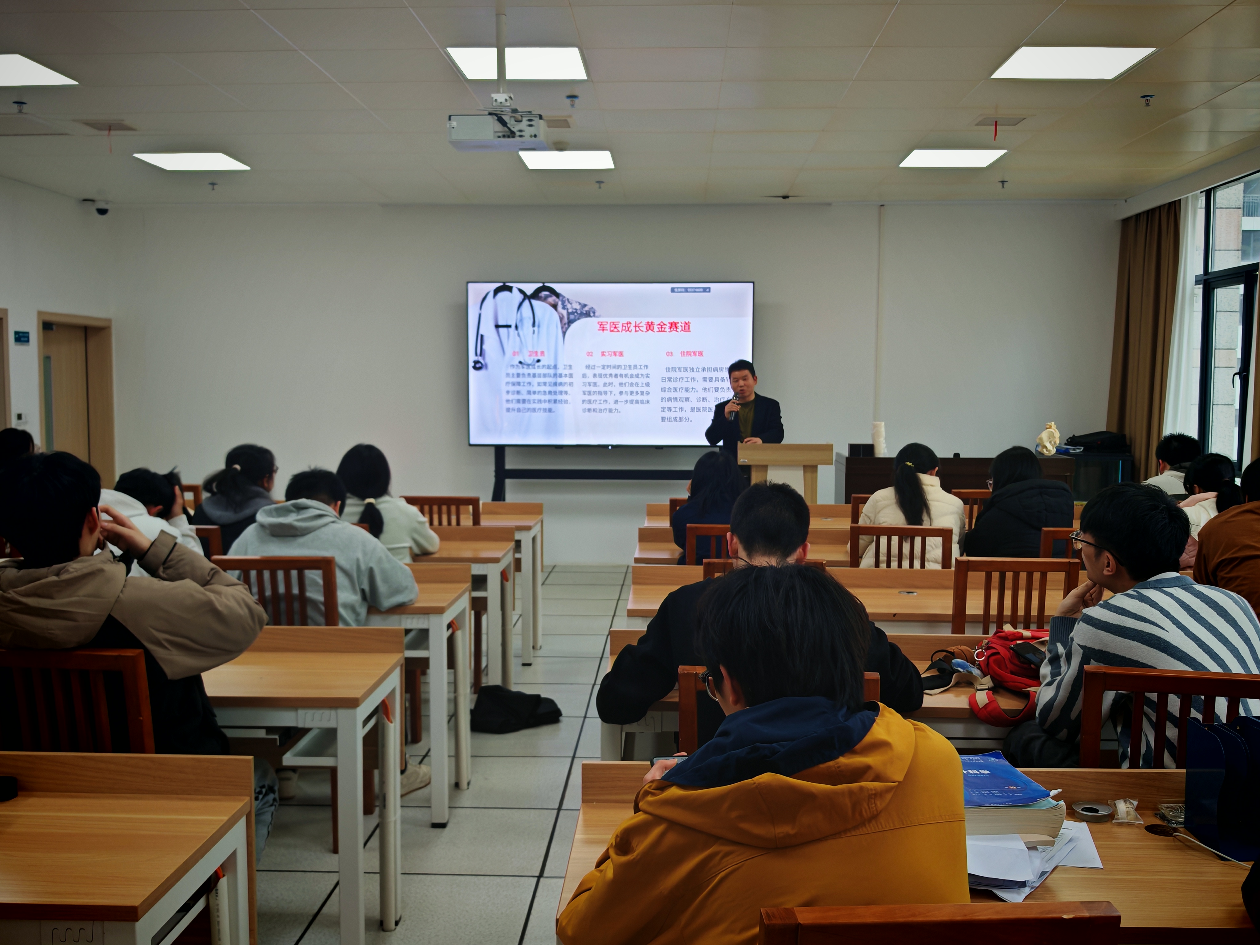 宣讲中特别强调了医学专业学生参军入伍的特殊意义。军队医疗岗位不仅承载着“救死扶伤”的医者使命,更肩负着“保家卫国”的神圣职责,是将“医者仁心”融入“强军战位”的光荣实践。这一鲜明的价值引领有效激发了医学生投身国防医疗事业的热情与使命感。