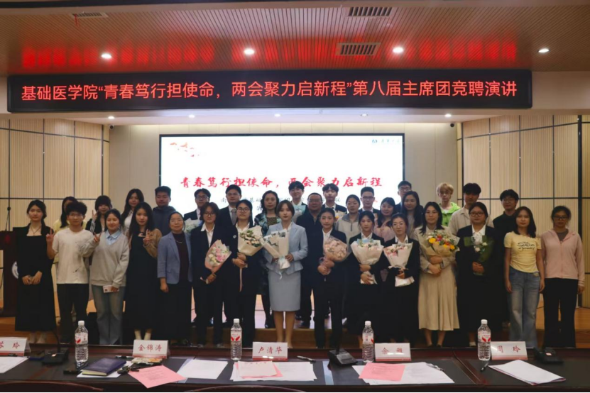 为加强新一届团学组织建设,4月18日晚,基础医学院“青春笃行担使命,两会聚力启新程”第八届主席团候选人竞聘演讲在医研楼学术报告厅举行。学院党委副书记卢清华、团委书记金锦涛,相关辅导员,团委学生会学社联主席团及2025级各班班长、团支书参加。13位候选人结合两会精神与个人经历进行演讲并答辩,师生代表现场民主投票。